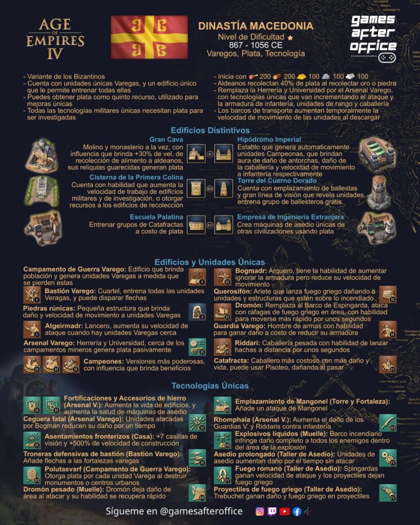 Dinastía Macedonia: La civilización de la plata, variante de los Bizantinos pero con mecánicas que cambian bastante su manera de jugar, mantiene el 5to recurso pero es usado en su mayoría para las mejoras, estas son para mejorar a tus propias unidades de manera independiente, infantería, arqueros y caballería.