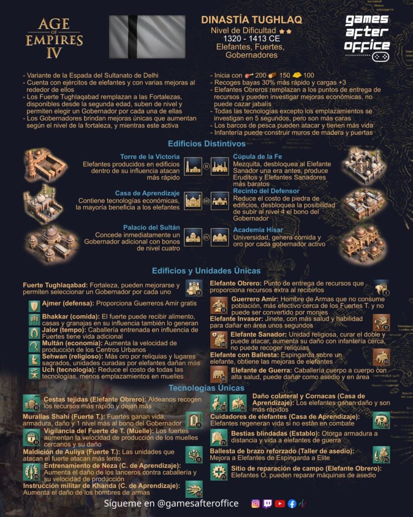 Dinastía Tughlaq, la variante del Sultanato de Delhi, especializada en elefantes, a diferencia de Delhi no cuenta con mejoras gratis, al contrario, sus investigaciones tienen un sobreprecio, pero solo toman 5 segundos en desarrollarse, lo que permite optar por las mejoras según la necesidad inmediata.