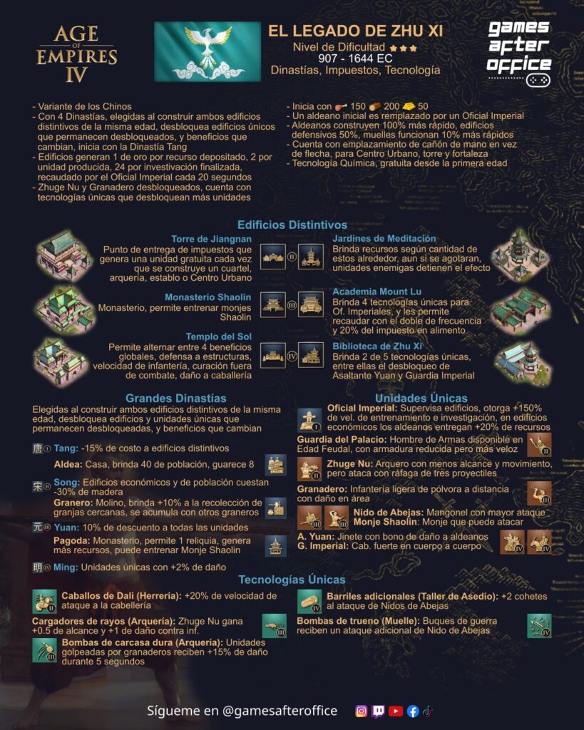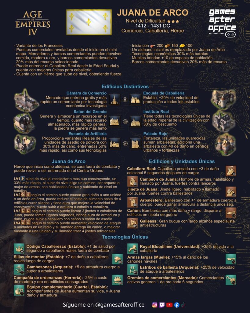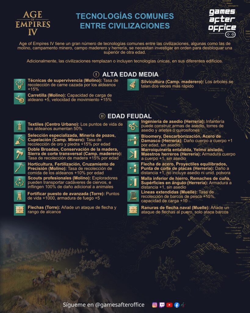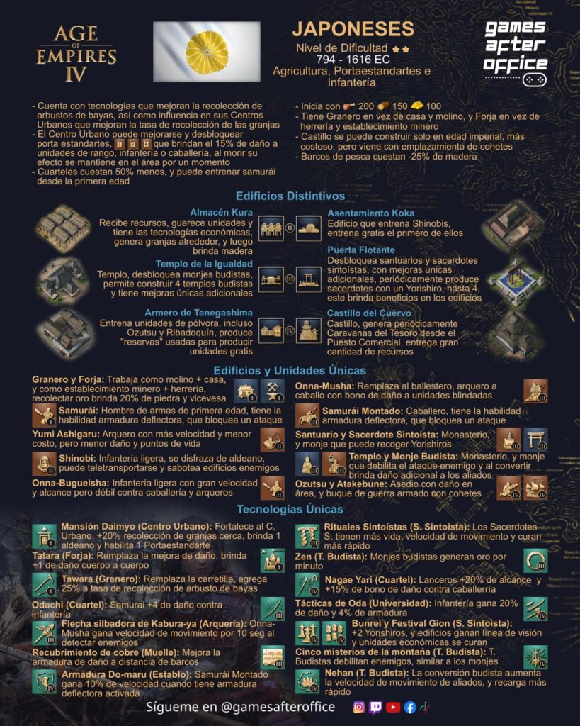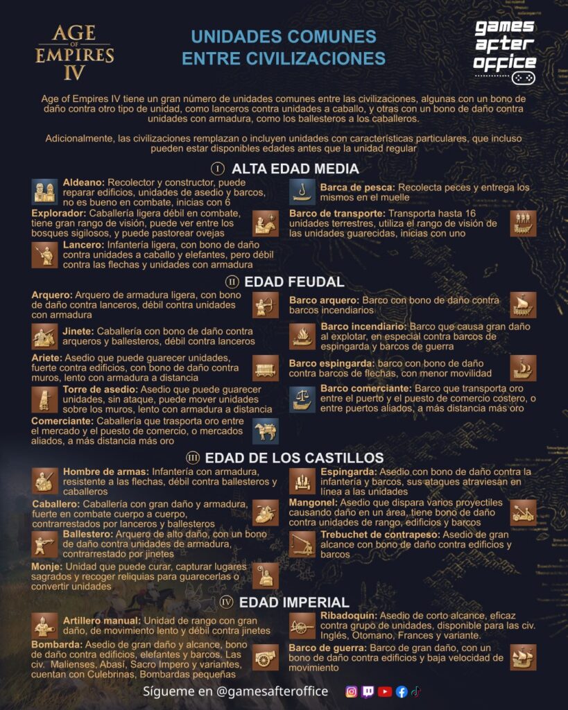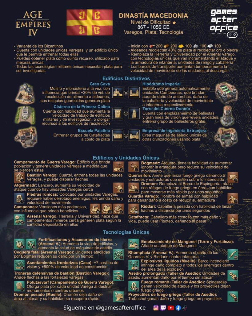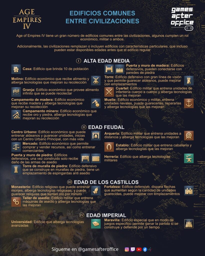 Hola a todos, les comparto las infografías diseñadas para el Age of Empires 4, en esta ocasión destinadas a describir a las civilizaciones y variantes del juego, muchos edificios, unidades y tecnologías son compartidas, siendo las siguientes: